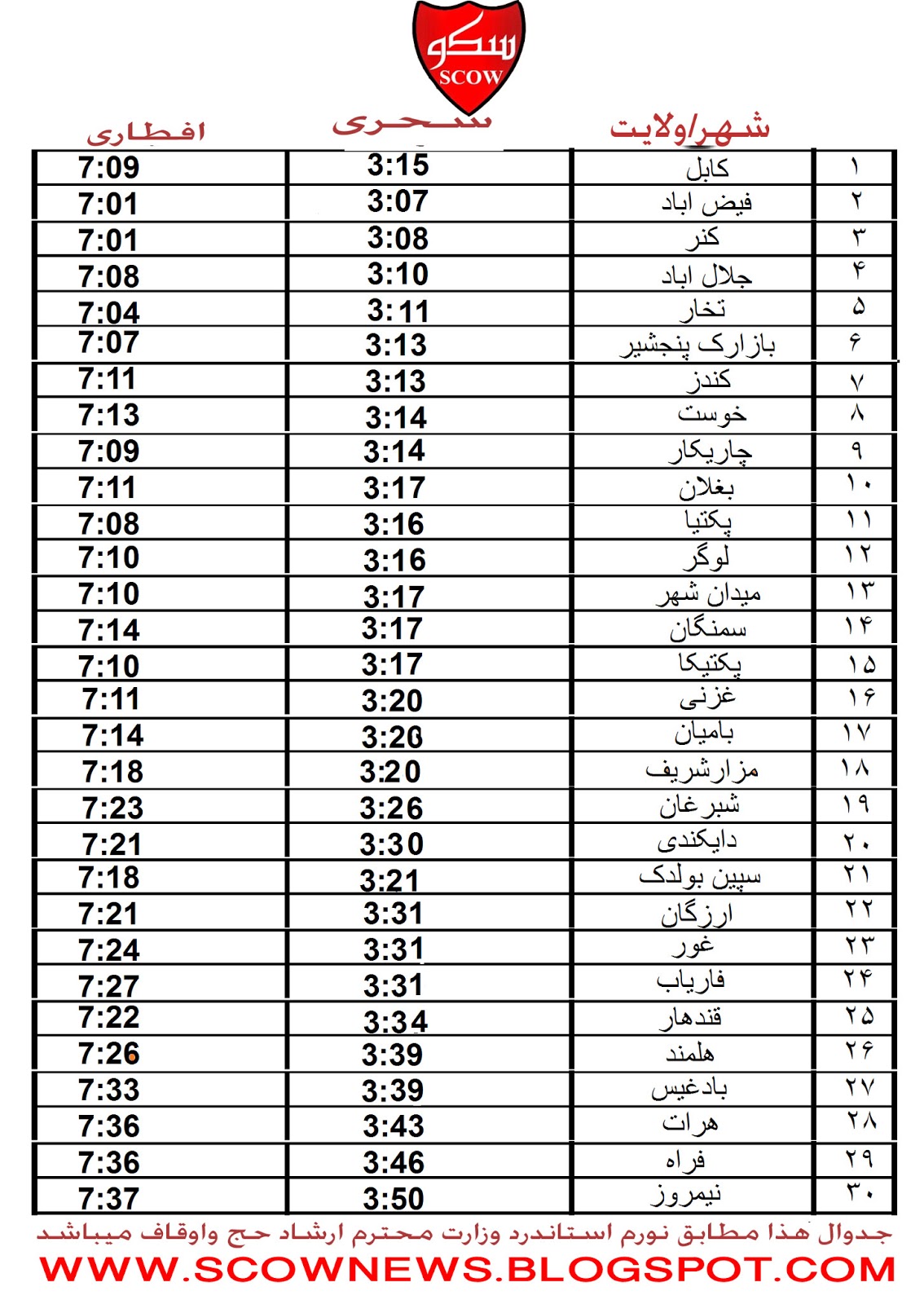 جدول اوقات سحری و افطاری ولایت کابل سال لیسه میر علم خان Facebook