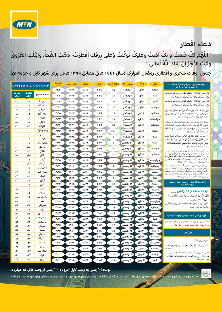 Mtn Afghanistan On Twitter جدول اوقات سحری و افطاری رمضان المبارک سال ۱۴۴۱هـ ق مطابق ۱۳۹۹ هـ ش برای شهر کابل و حومه آن Mtn Mtna Mtnaf Mtnafghanistan Only4u Everywhereyougo Wearegoodtogether Ramadan