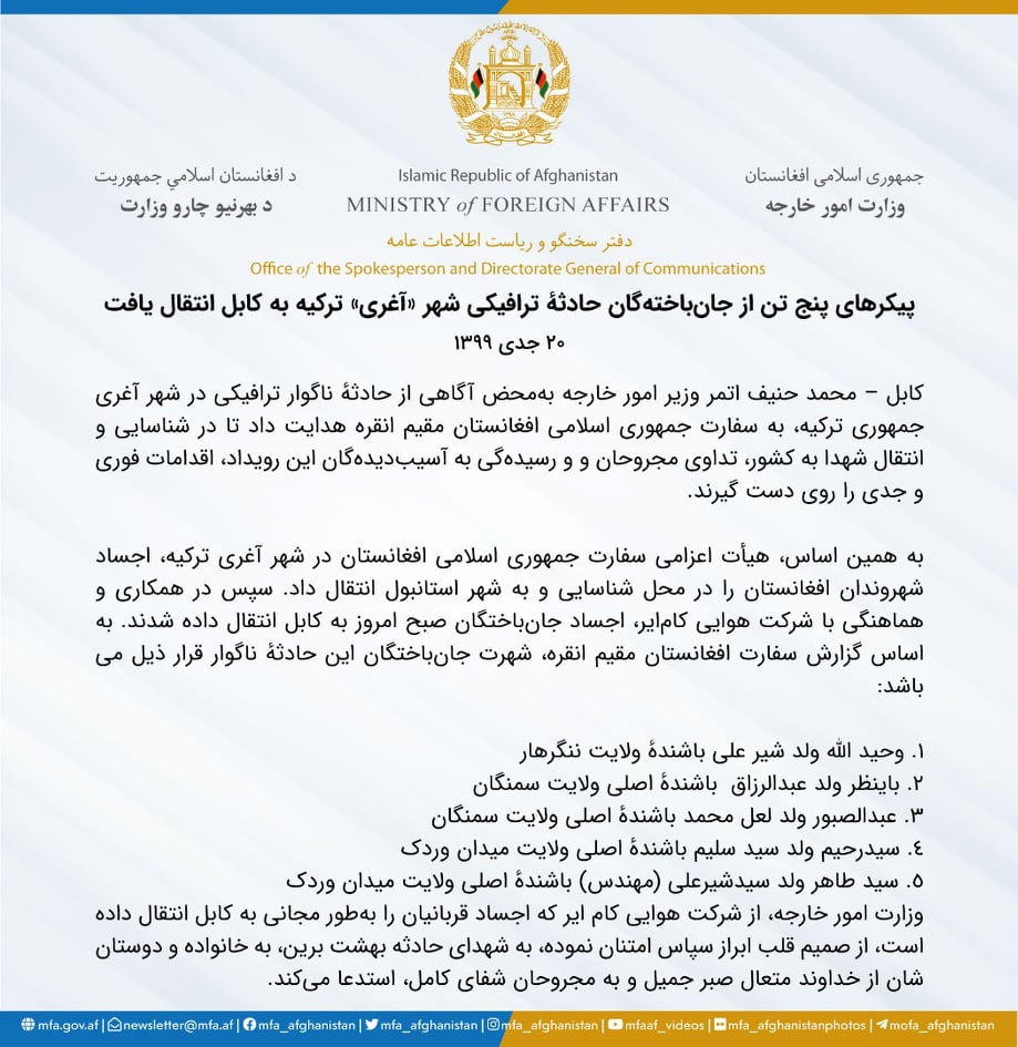 Shamshadnews On Twitter Dead Bodies Of Five Afghans Who Were Killed In A Road Accident In Aghari City Of Turkey Were Shifted To Afghanistan The Ministry Of Foreign Affairs Said In A