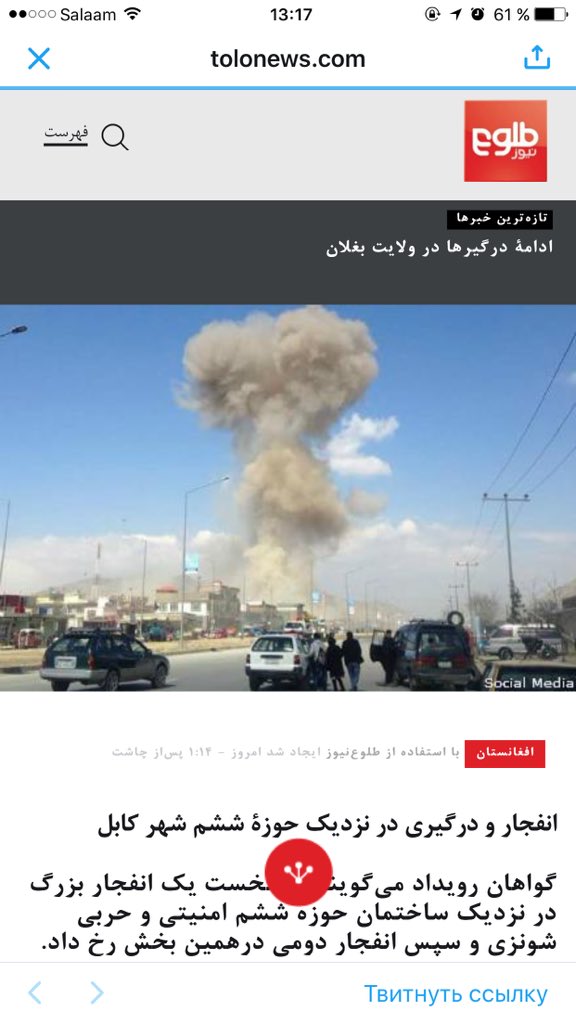 پیام آفتاب فوری انفجار در حوزه ششم امنیتی شهر کابل