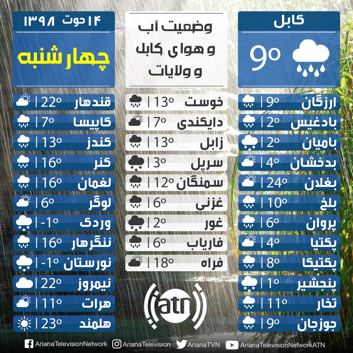 Arianatvn On Twitter وضعیت آب و هوای امروز کابل و دیگر ولایات ۱۴ حوت ۱۳۹۸ Https T Co Ljdsbwogmd Arianatelevision Ariana Atn Arianatv Aryanatv Weather Afghanistanweather Kabul Herat Balkh Jalalabad Kandahar Ghazni Bamyan