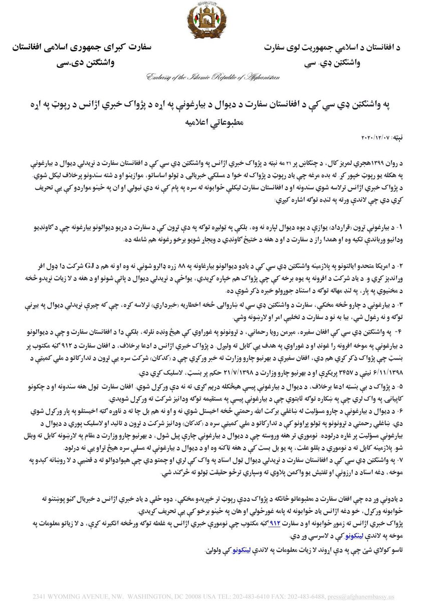 جوابیه وزارت امور خارجه در پیوند به گزارش خبرگزاری پژواک در مورد پروژه اعمار دیوار سفارت در واشنگتن وزارت امور خارجه جمهوری اسلامی افغانستان