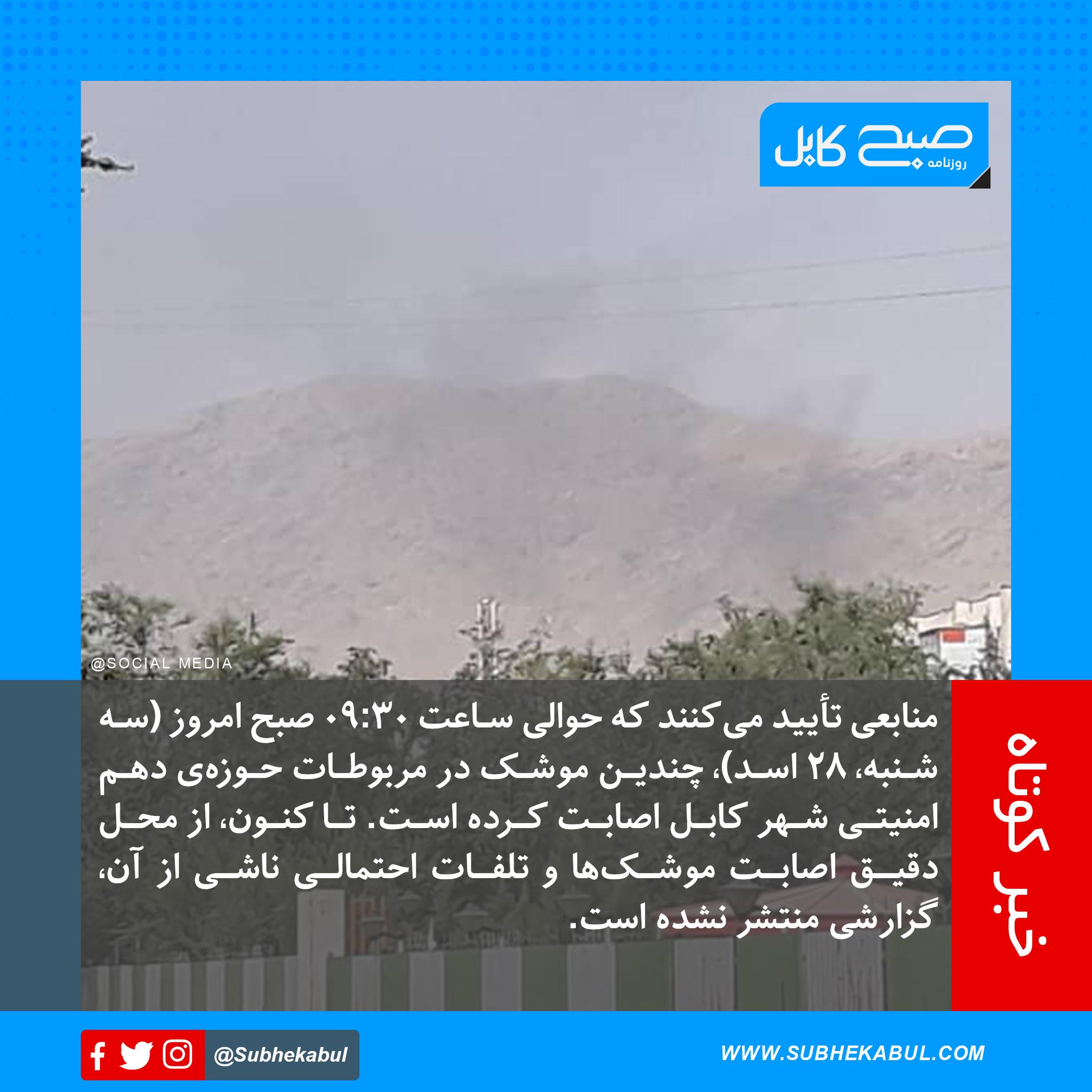 Subhe Kabul Daily On Twitter منابعی تأیید می کنند که حوالی ساعت 09 30 صبح امروز سه شنبه 28 اسد چندین موشک در مربوطات حوزه ی دهم امنیتی شهر کابل اصابت کرده است تا کنون از