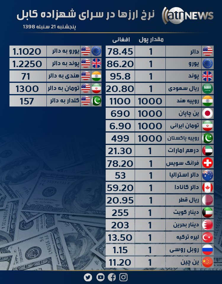 نرخ ارزهای خارجی در بازار امروز کابل 5 عقرب