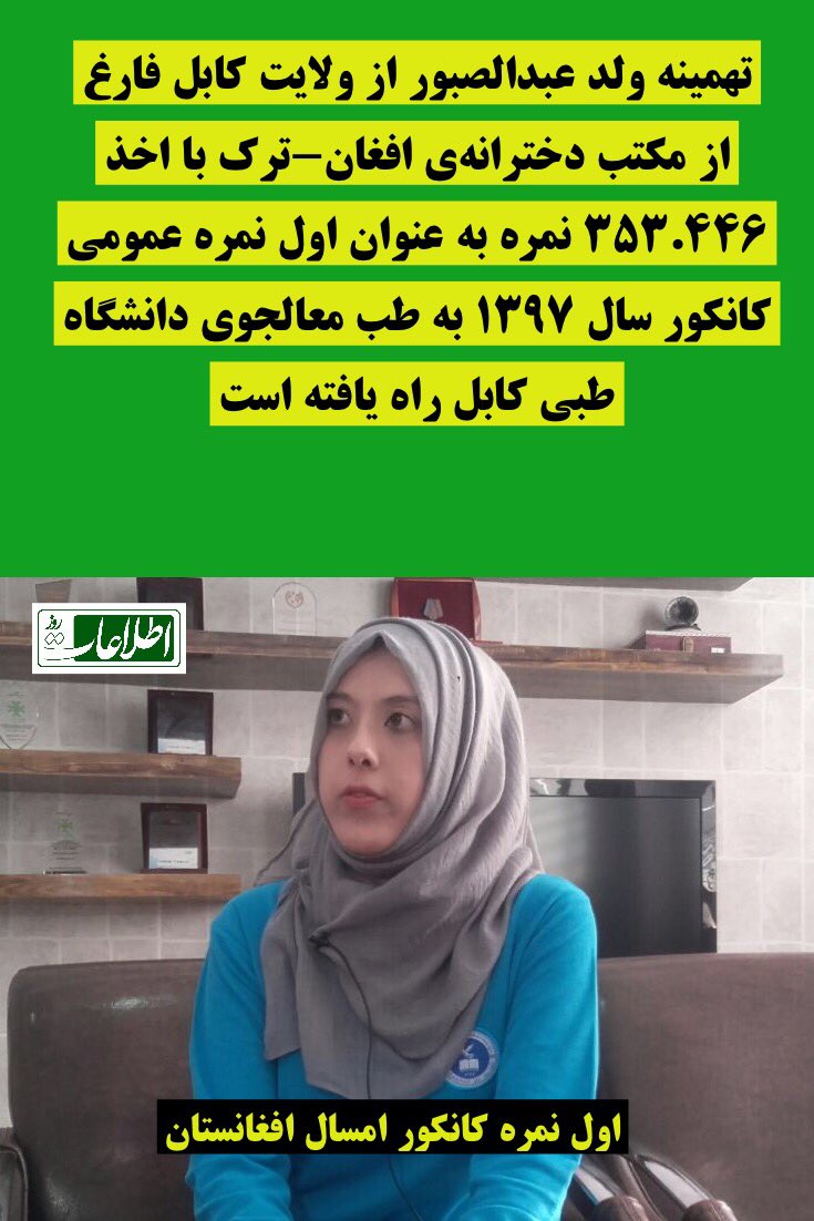 اطلاعات روز Etilaatroz Pa Twitter اول نمره عمومی امتحان کانکور امسال در افغانستان دختری از لیسه افغان ترک شد تهمینه در کابل است و به اطلاعات روز گفت از اول نمرگی