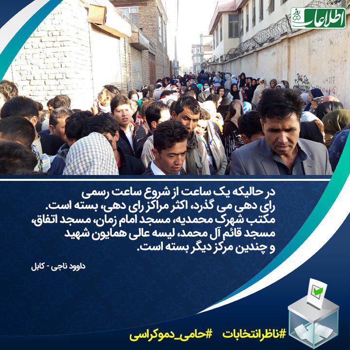 اطلاعات روز Etilaatroz V Twitter داوود ناجی یکی از نامزدان انتخابات پارلمانی از حوزه ی انتخاباتی کابل نوشته است در حالیکه یک ساعت از شروع ساعت رسمی رای دهی می گذرد اکثر