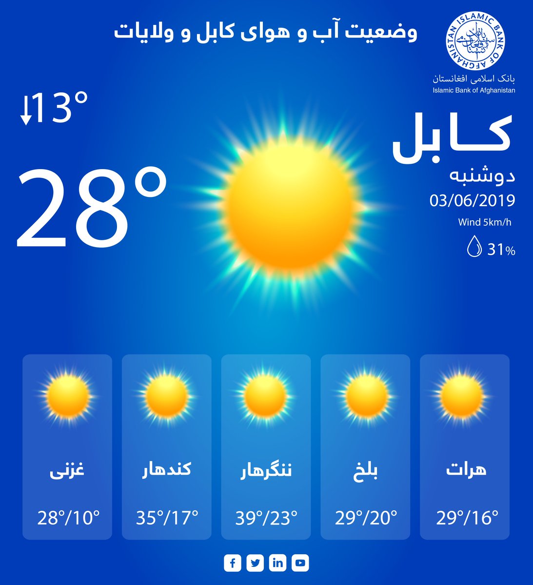 Islamic Bank Of Afghanistan On Twitter وضعیت آب و هوای امروز کابل و دیگر ولایات ۱۳ جوزا ۱۳۹۸ Islamicbankofafghanistan Iba Islamicbank Bank Kabul Herat Balkh Jalalabad Kandahar Ghazni Weatherforcast Afghanistanweather Https T Co
