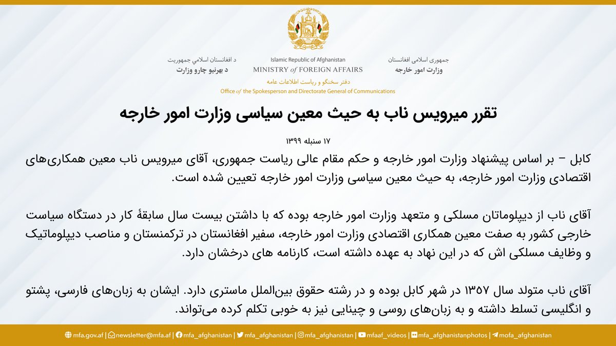 Ministry Of Foreign Affairs Afghanistan On Twitter بر اساس پیشنهاد وزارت امور خارجه و حکم مقام عالی ریاست جمهوری آقای میرویس ناب معین همکاریهای اقتصادی وزارت امور خارجه به حیث