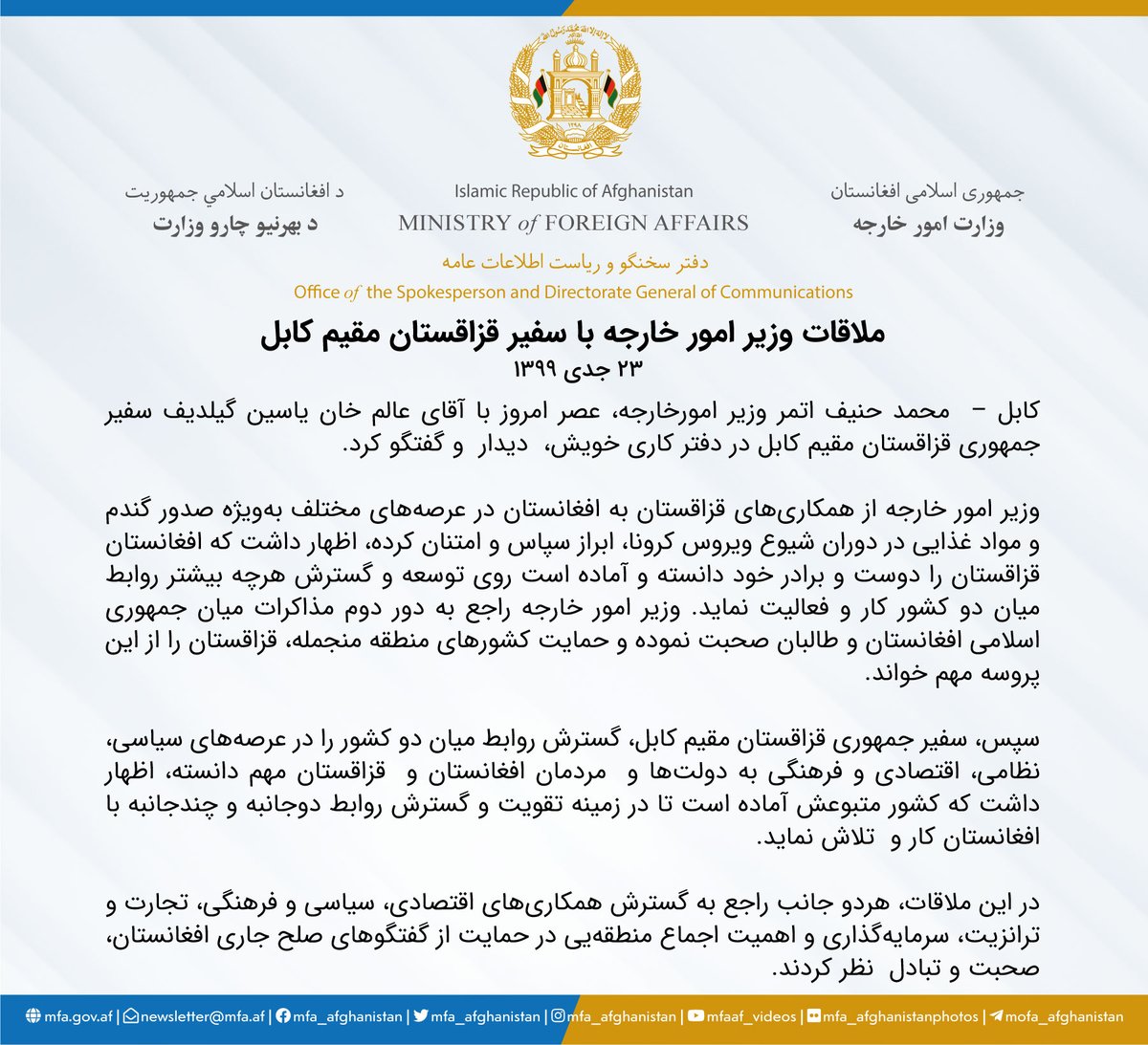 Ministry Of Foreign Affairs Afghanistan On Twitter ملاقات وزیر امور خارجه با سفیر قزاقستان مقیم کابل