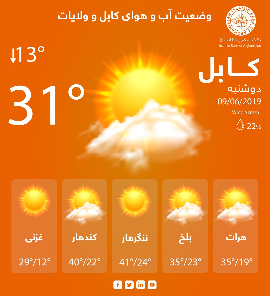 Islamic Bank Of Afghanistan On Twitter وضعیت آب و هوای امروز کابل و دیگر ولایات ۱۳ جوزا ۱۳۹۸ Islamicbankofafghanistan Iba Islamicbank Bank Kabul Herat Balkh Jalalabad Kandahar Ghazni Weatherforcast Afghanistanweather Https T Co