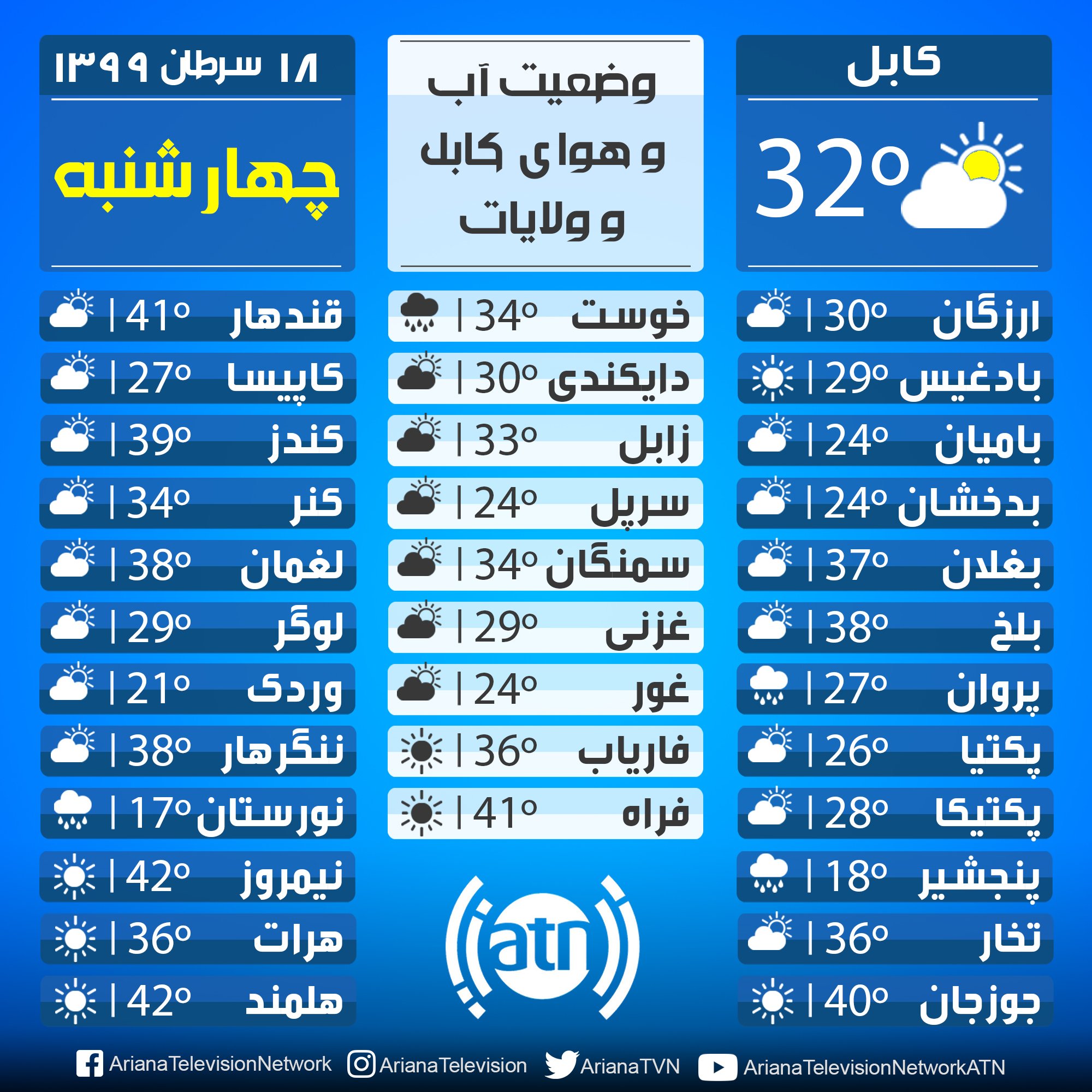 Ariana Television A Twitter وضعیت آب و هوای امروز کابل و دیگر ولایات ۱۸ سرطان ۱۳۹۹ Https T Co Ljdsbx6ian Arianatelevision Ariana Atn Arianatv Aryanatv Weather Afghanistanweather Kabul Herat Balkh Jalalabad Kandahar Ghazni