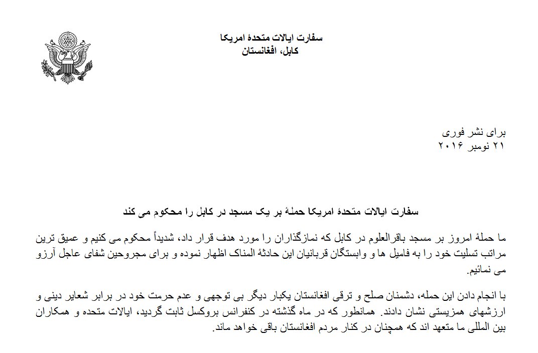 U S Embassy Kabul On Twitter سفارت ایالات متحدۀ امریکا حملۀ بر یک مسجد در کابل را محکوم می کند Https T Co T4txhqpsbo