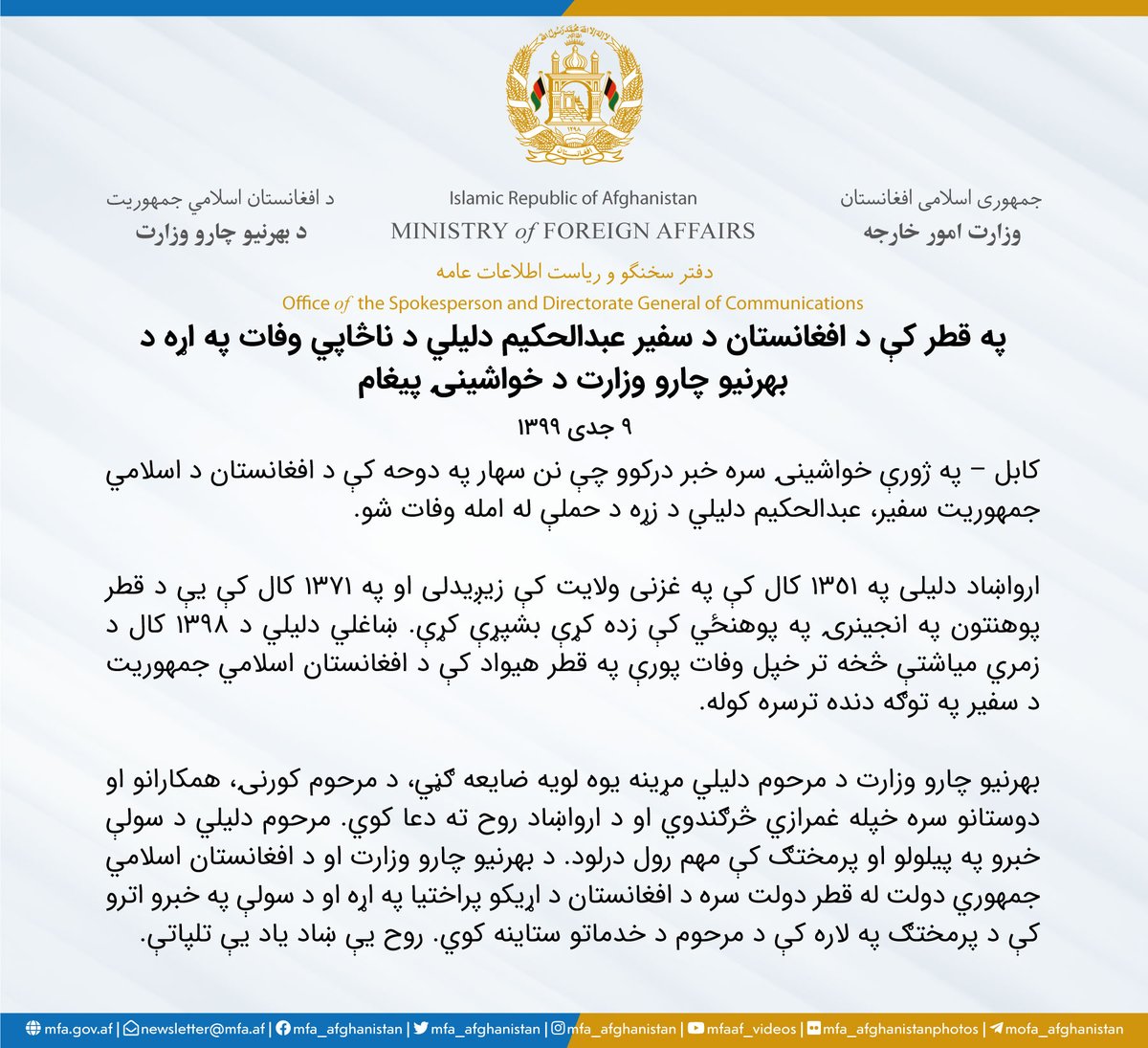 د افغانستان د اسلامي جمهوریت مذاکره کوونکي پلاوي په دوحه کې د افغانستان په سفارت کې د قرآن کریم د ختم په مراسمو کې ګډون وکړ د سولې په چارو کې د دولت