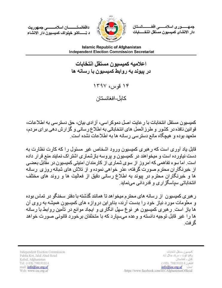 Independent Election Commission Of Afghanistan على تويتر اعلامیه کمیسیون مستقل انتخابات در پیوند به روابط کمیسیون با رسانه ها ۱۴ قوس ۱۳۹۷ کابل افغانستان Https T Co Vyepqgjt1x Https T Co Whj8ejaghf