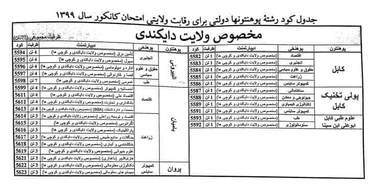 University S Code Chart For Kankor 97 Ba 98 Kankor Afghanistan