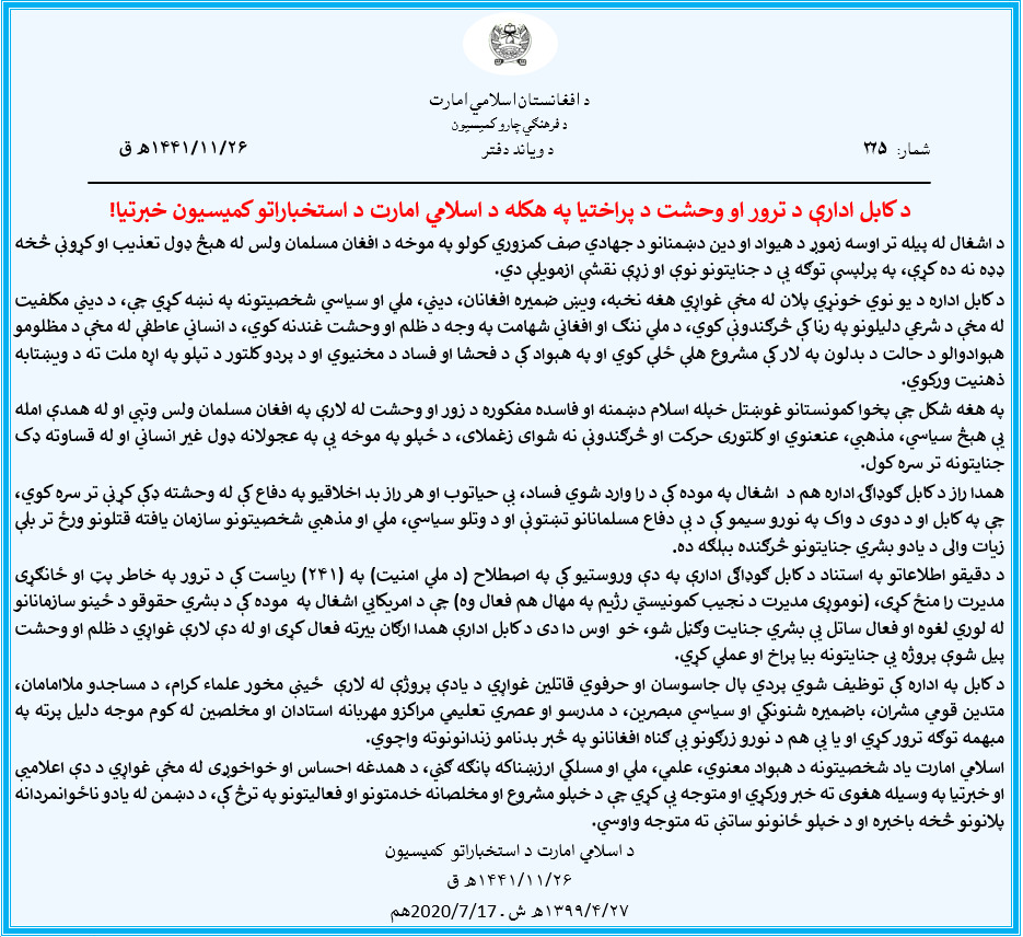 Zabihullah ذبـــــیح الله م On Twitter د کابل ادارې د ترور او وحشت د پراختيا په هکله د اسلامي امارت د استخباراتو کمیسیون خبرتيا Https T Co Np3qqqsqfe