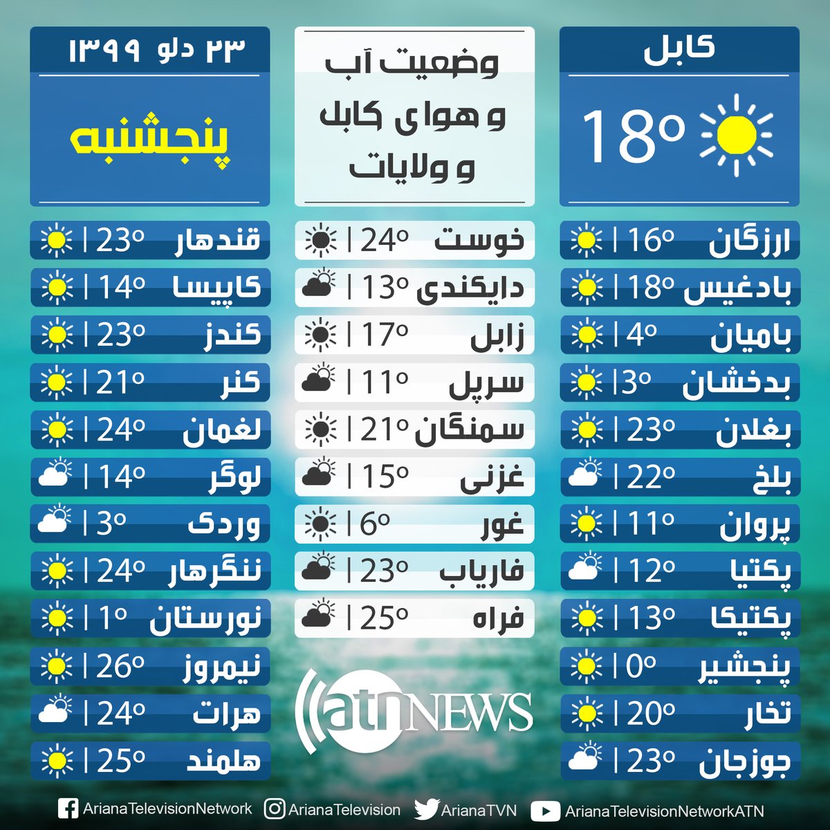 Ariana Television On Twitter وضعیت آب و هوای امروز کابل و دیگر ولایات ۱۱ جوزا ۱۳۹۹ Https T Co Ljdsbx6ian Arianatelevision Ariana Atn Arianatv Aryanatv Weather Afghanistanweather Kabul Herat Balkh Jalalabad Kandahar Ghazni